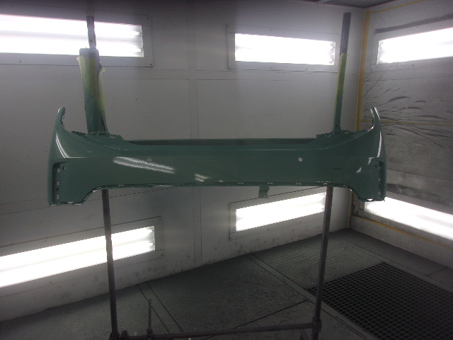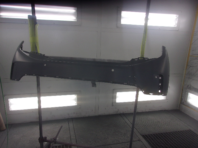 新品のリヤバンパーになります。こちらはソナーの取付穴が開いた状態での供給になりますが、一部の輸入車ではソナーの穴等開いてい状態での供給がございます。また輸入車はほぼ未塗装状態での供給になりますのでこちらもご注意下さい。塗装の準備をし、塗装の工程に入っていきます。