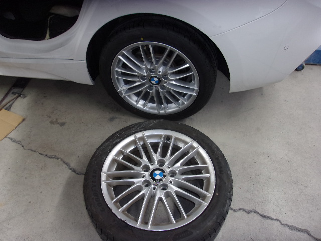 塗装と磨きが終わりましたら組付けの作業になります。ここで合わせて注文し既に組付けしてもらってる新品のアルミホイールとタイヤを付け替えます。